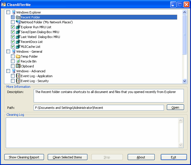 CleanAfterMe este o aplicatie ce nu necesita instalare astfel o puteti rula si de pe un stick USB fara sa lase nici o urma in registri. Este foarte utila daca folositi alte computere si nu doriti sa se afle ce ati lucrat pe ele.