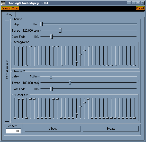 AnalogX Audio Arpeg este foarte similar cu partea MIDI din DirectX - tu poti controla un sunet chiar daca este ascultat sau nu, si se poate crea ritm cu ajutorul comenzii mutes/unmutes. Spre deosebire de arpegiatorul MIDI normal, Audio Arpeg permite controlul nivelului de sunet pentru fiecare dintre stadiile mute/unmute. Fiecare canal poate fi sters pana la 1 secunda si i se poate seta tempo-ul independent.